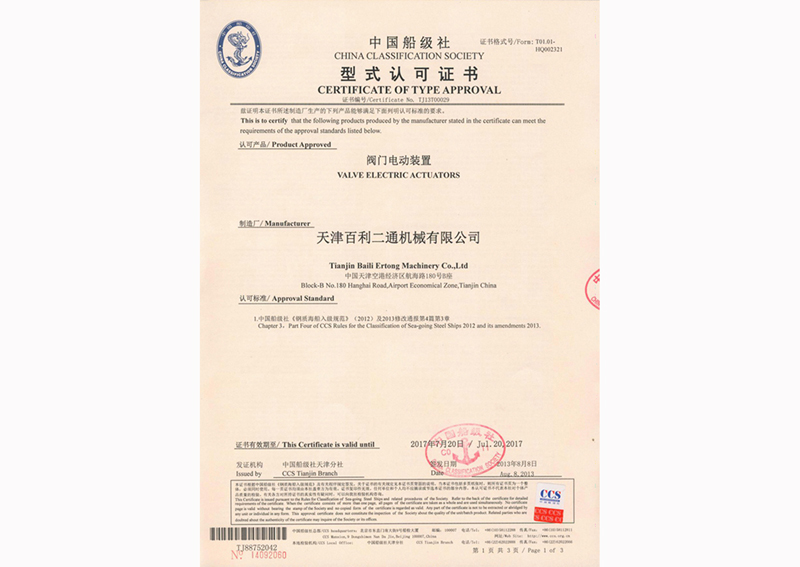 天津百利二通機械有限公司作為國內(nèi)首家,也是國內(nèi)唯一獲得中國船級社CCS國際航行船舶范圍閥門電動裝置產(chǎn)品型式認(rèn)可證書單位。2013年8月8日,公司順利通過2009年型式認(rèn)可證書到期換證工作。