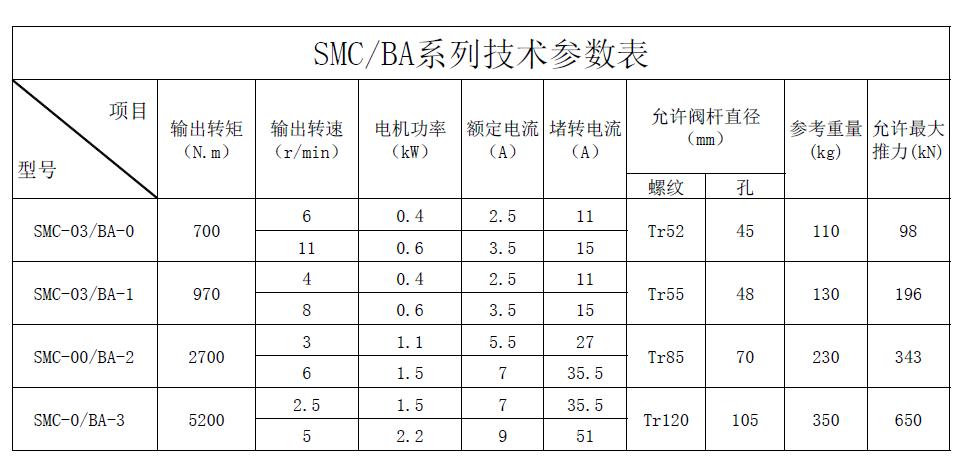 SMC/BA系列電動裝置是SMC系列中小轉(zhuǎn)矩多回轉(zhuǎn)電動裝置與BA圓錐齒輪減速器的一種組合型式,它適合閘閥、截止閥等多回轉(zhuǎn)閥門的驅(qū)動控制。SMC/BA電動裝置具有以下特點:以較小轉(zhuǎn)矩規(guī)格的SMC電動裝置與BA減速器組合可獲得更大的輸出轉(zhuǎn)矩。在輸出轉(zhuǎn)速允許的條件下,選用該產(chǎn)品能夠提高所選電動裝置規(guī)格的通用性,便于產(chǎn)品的使用、維護(hù)。