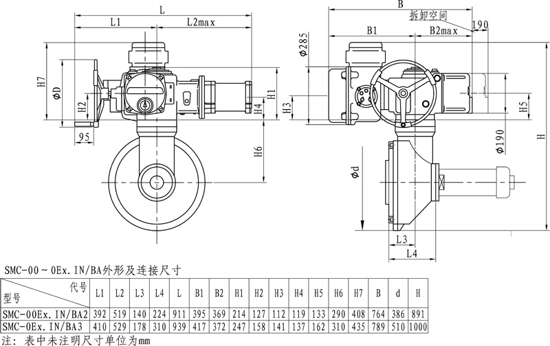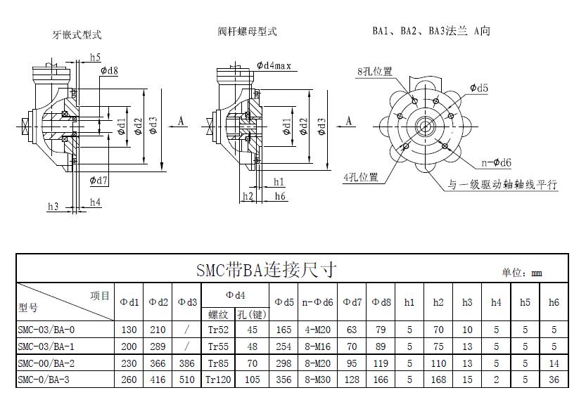 SMC/BA系列電動裝置是SMC系列中小轉(zhuǎn)矩多回轉(zhuǎn)電動裝置與BA圓錐齒輪減速器的一種組合型式,它適合閘閥、截止閥等多回轉(zhuǎn)閥門的驅(qū)動控制。SMC/BA電動裝置具有以下特點:以較小轉(zhuǎn)矩規(guī)格的SMC電動裝置與BA減速器組合可獲得更大的輸出轉(zhuǎn)矩。在輸出轉(zhuǎn)速允許的條件下,選用該產(chǎn)品能夠提高所選電動裝置規(guī)格的通用性,便于產(chǎn)品的使用、維護。